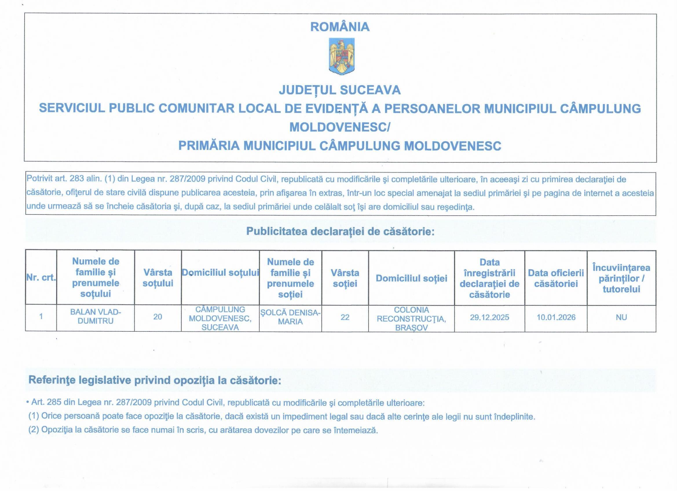 Publicația de căsătorie Nr. 70 din 29-12-2025