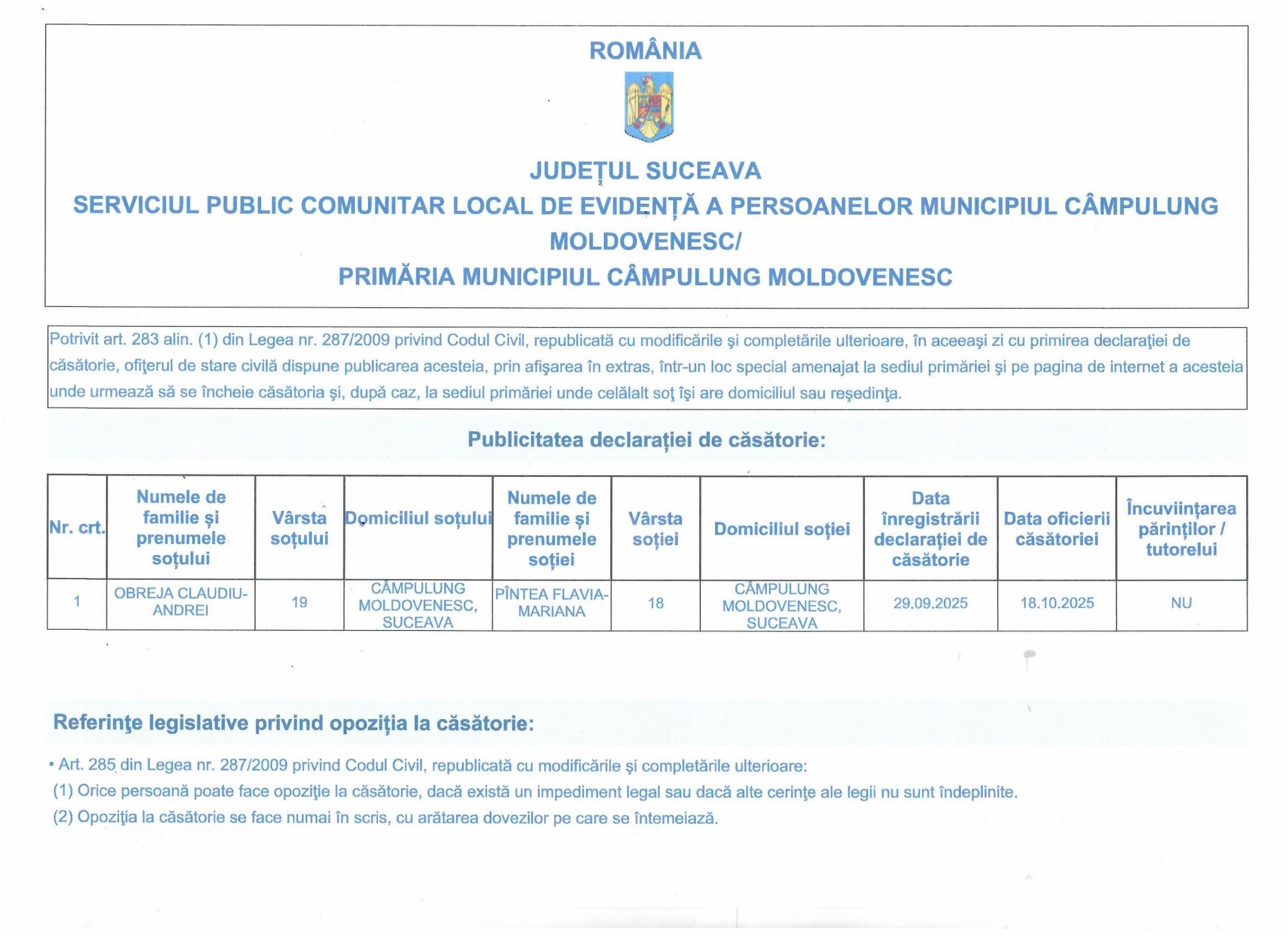 Primăria Municipiului Câmpulung Moldovenesc pune la dispoziția cetățenilor un sistem de programări online pentru căsătorii.