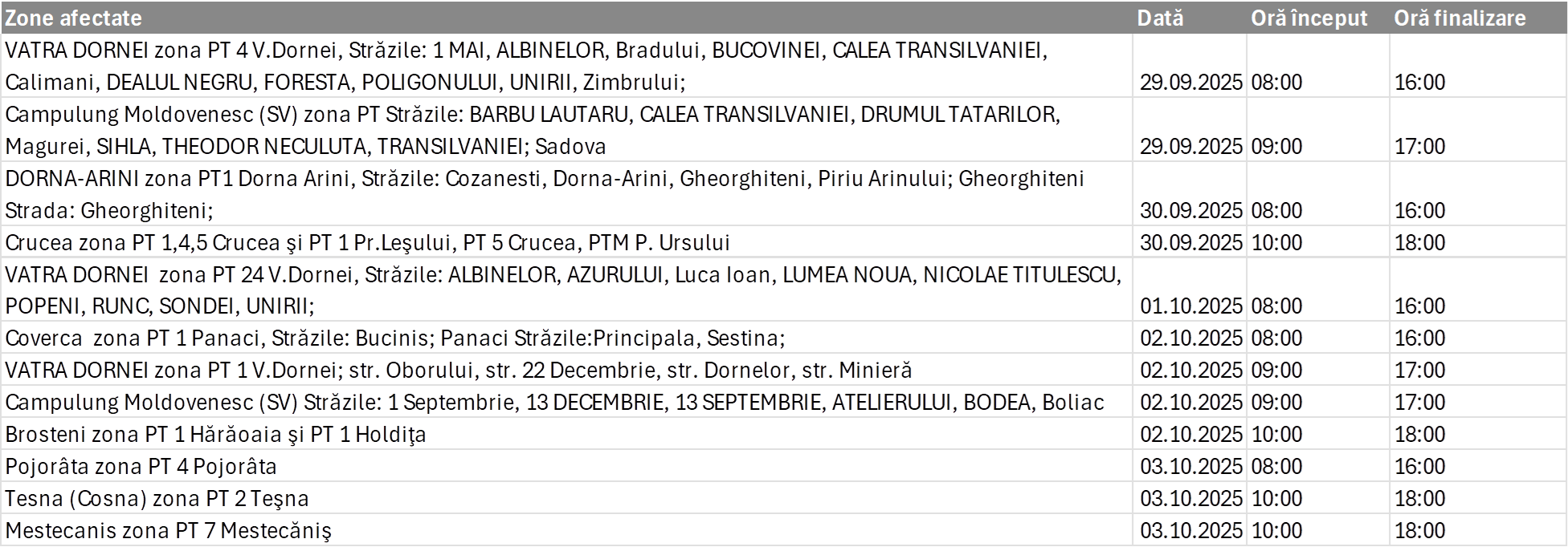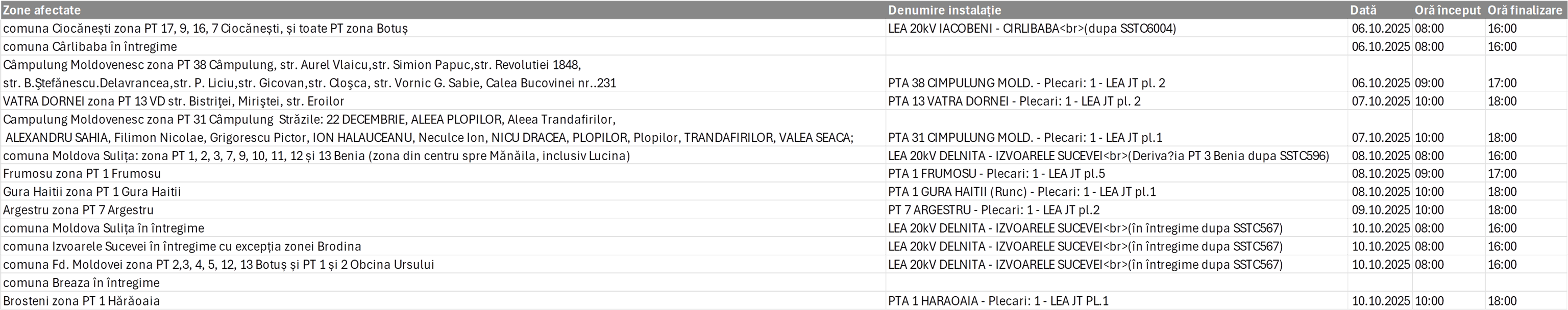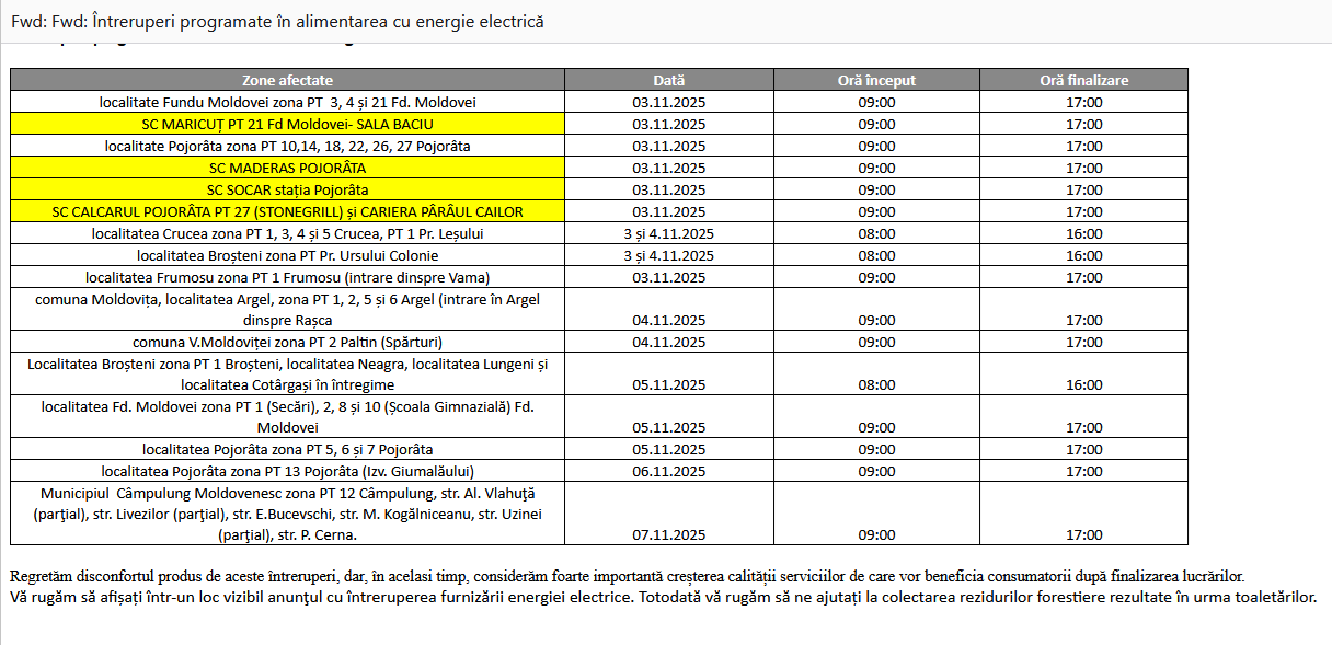 În vederea executării lucrărilor în condiţii de siguranţă, sunt necesare întreruperi în alimentarea cu energie electrică a consumatorilor pentru localitatea Campulung Moldovenesc, după cum urmează: