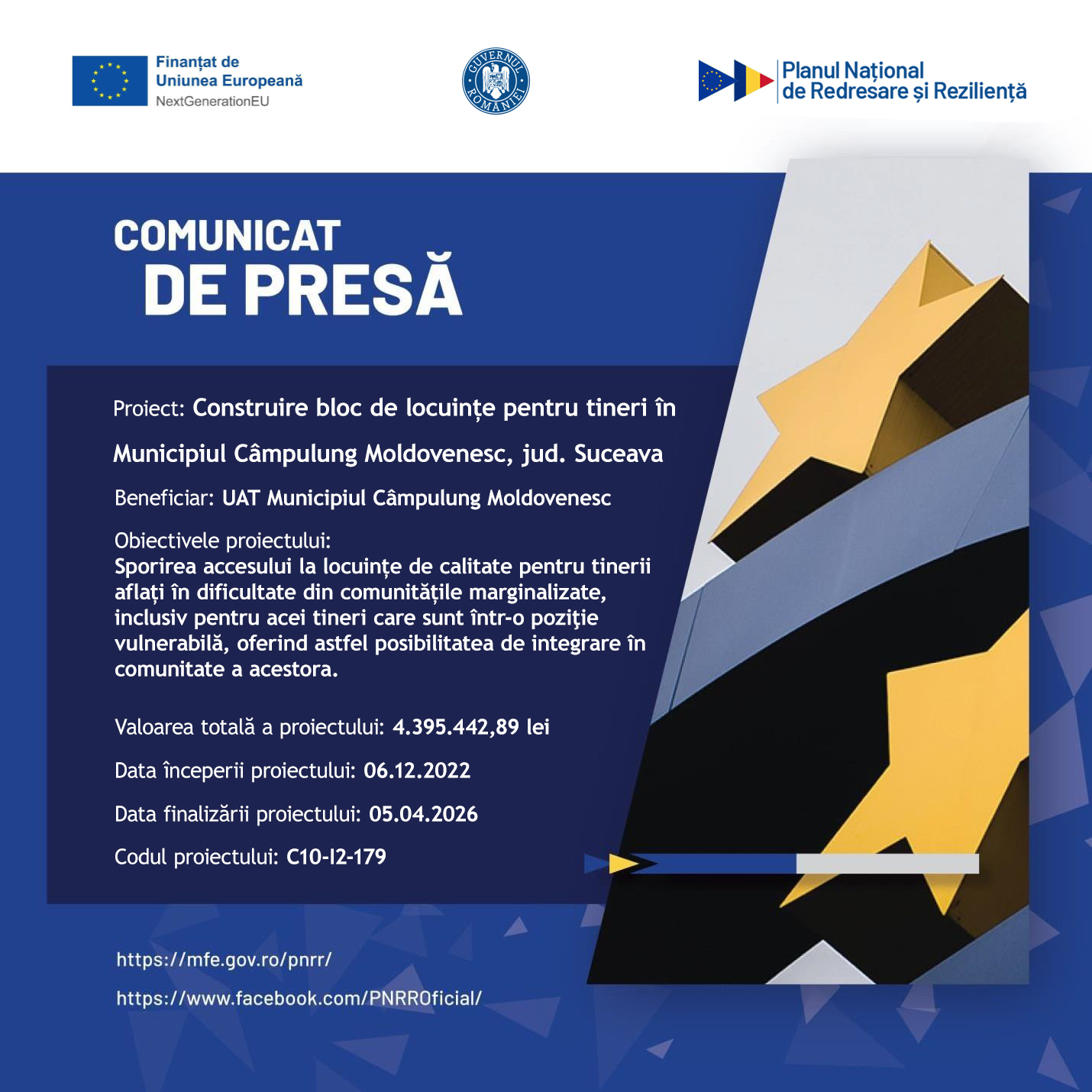 18. Proiect „PNRR: Fonduri pentru România Modernă și Reformată!” - Construire bloc de locuințe pentru tineri în Municipiul Câmpulung Moldovenesc, județul Suceava Titlul apel: PNRR/2022/C10/I2 Codul proiectului: C10-I2-179