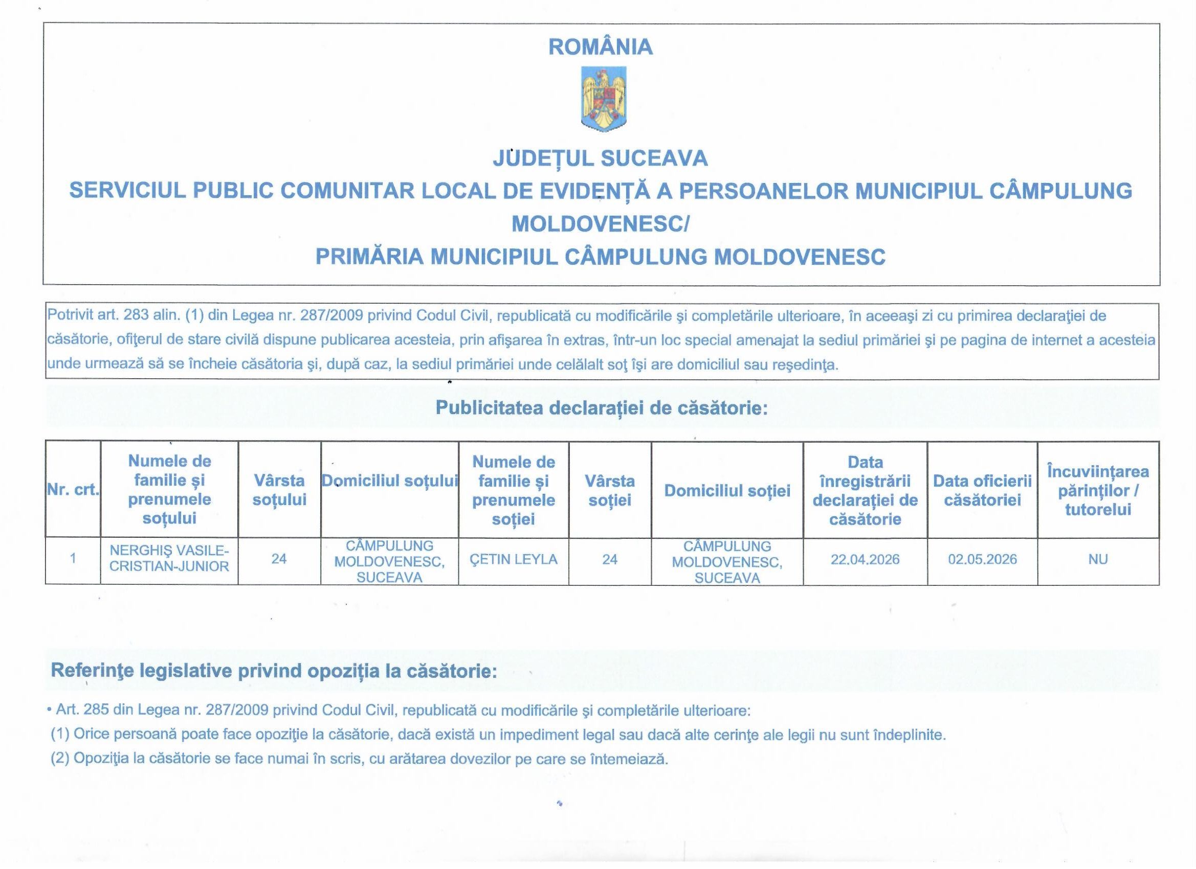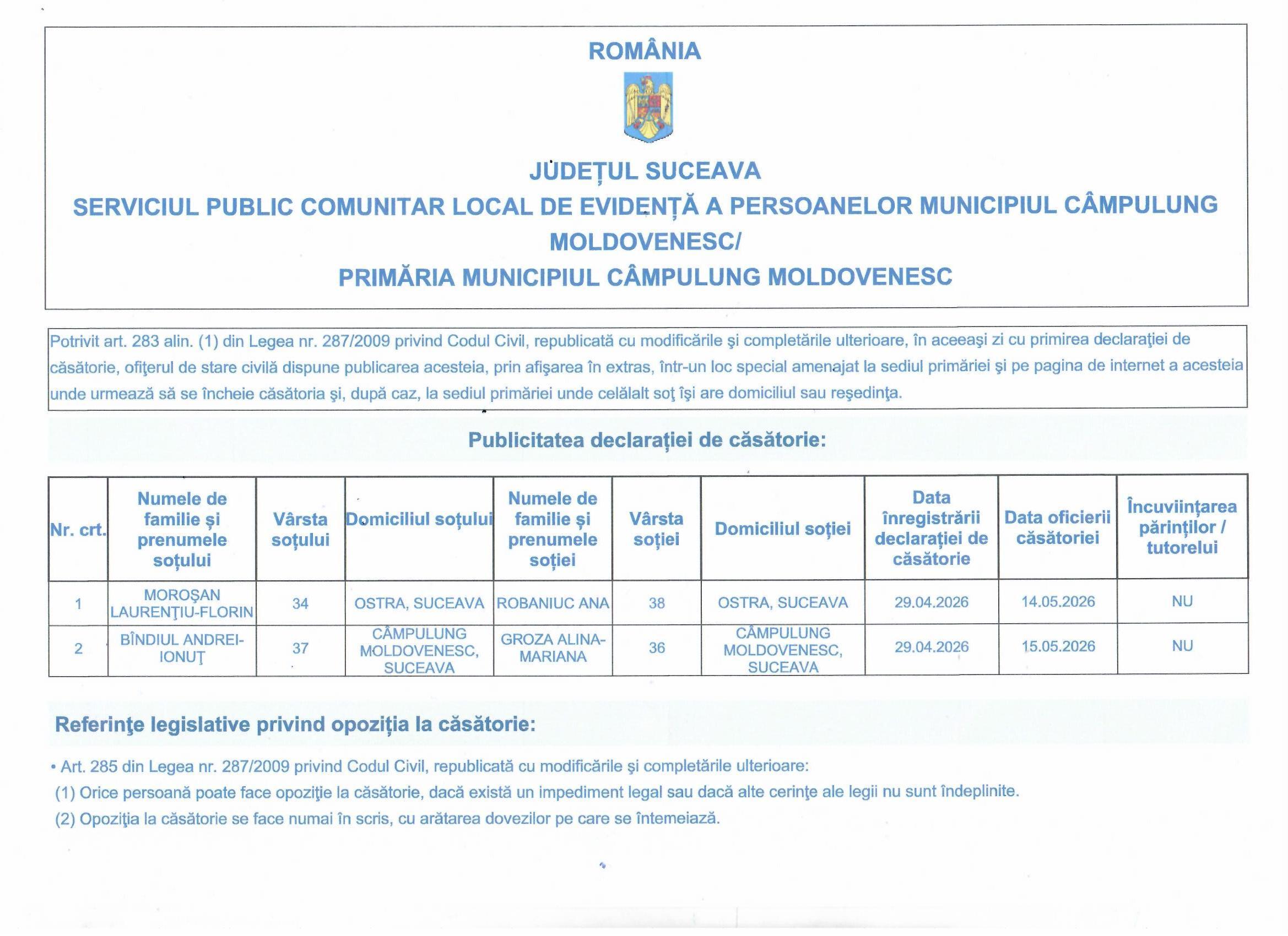 Ofiţerul de stare civilă dispune publicarea declaraţiei de căsătorie în ziua primirii acesteia, prin afişarea în extras într-un loc special amenajat la sediul serviciului public comunitar local de evidenţă a persoanelor sau al primăriei, respectiv al misiunii diplomatice sau al oficiului consular unde urmează să se încheie căsătoria, precum şi pe pagina de internet a acestuia/acesteia. După caz, declaraţia de căsătorie se afişează şi la sediul serviciului public comunitar local de evidenţă a persoanelor sau al primăriei unde celălalt soţ îşi are domiciliul sau reşedinţa.